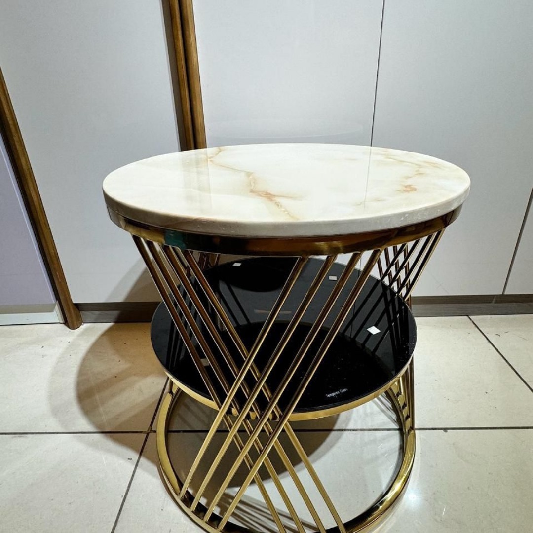 Enhance your living space with these stunning Marble Round Center Tables. This set includes two tables with luxurious marble tops, showcasing white and grey veining patterns that add a touch of elegance. The geometric metallic bases with a gold finish provide a modern and sophisticated look, perfectly complementing the marble tops. Ideal for contemporary interiors, these tables serve as both functional surfaces and stylish focal points. The sizes of the tables make them versatile, allowing for various arrangements in your living room or lounge area.